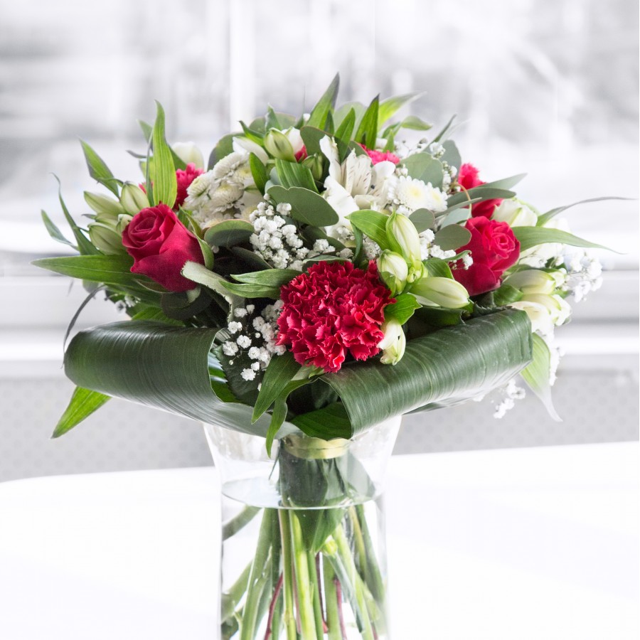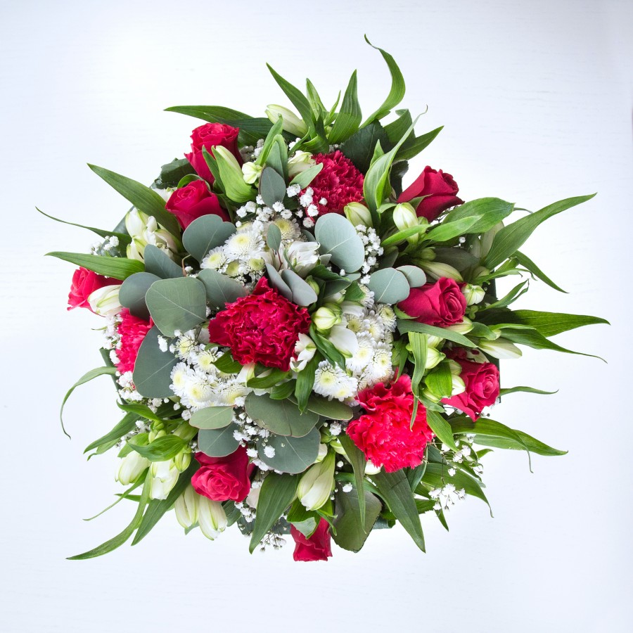Our Splendid Harmony Bouquet offers a mesmerizing blend of red roses, white chrysanthemums, and gypsophila. Enhanced with vibrant carnations and elegant white alstroemeria, all thoughtfully arranged with lush aspidistra leaves for a sophisticated look.