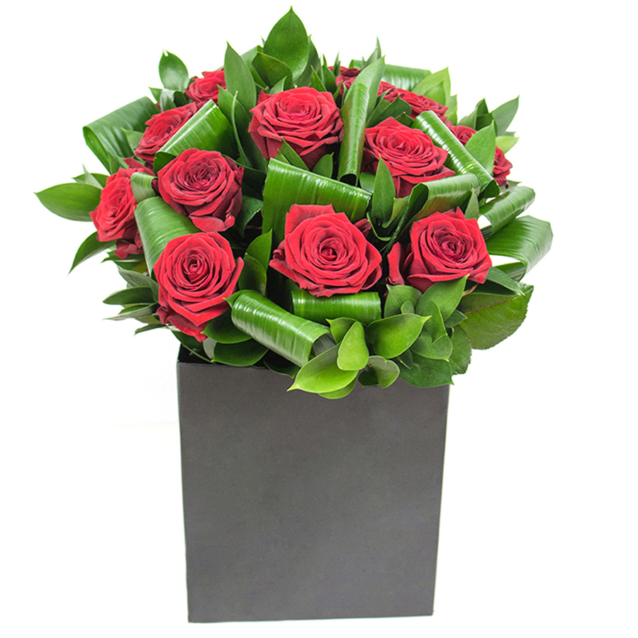 Illuminate any space with our radiant bouquet of vibrant red roses, enriched by lush aspidistra leaves and delicate ruscus. Each bloom is hand-selected to ensure freshness and premium quality, offering a luxurious and meaningful gift.