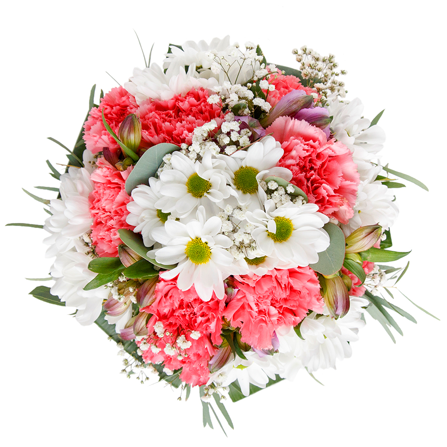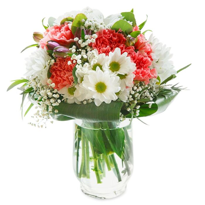 Bring joy and elegance with our beautifully unique flower arrangement. This luxurious bouquet showcases a delicate mix of snow-white chrysanthemums, playful gypsophila, charming light pink carnations, and vibrant aspidistra leaves, all carefully hand-selected for their exceptional freshness.